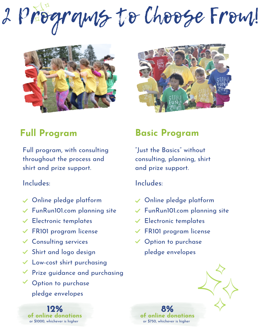 Our programs provide you with all the resources for a successful fun run and the choice of how much outside support your group needs. And while our pledge system does allow you to enter cash/check donations, NO FEE is assessed on them. Contact Us to get running!